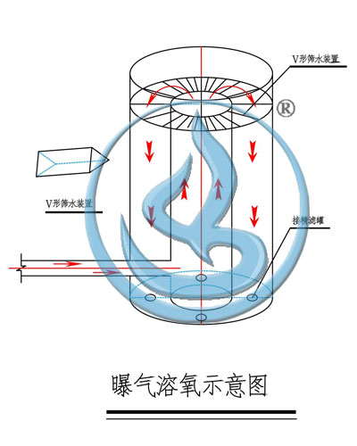 在曝氣溶氧(吐故納新器)中,源水從其中的內桶上升,在頂端溢流流到360度輻射水槽中,在水槽中水流分三部分跌落,在空中形成三個極薄的水幕。也就是說水流充分細分,增大水流與空氣的接觸面積,使得水中富含溶解氧,同時水體中的有機物、含氮磷物質、氨氣、二氧化碳等有害氣體從水流表面溢出。
