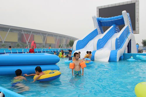 水上樂園的支架游泳池、充氣游泳池因材質(zhì)和構(gòu)造等問題,與固定基礎(chǔ)式游泳池水質(zhì)管理有些區(qū)別。環(huán)繞式布局的循環(huán)過濾凈水系統(tǒng)相對于與固定基礎(chǔ)式游泳池循環(huán)過濾凈水系統(tǒng)的水質(zhì)處理較直觀主動,但需人工輔助,而對固定基礎(chǔ)式游泳池的水質(zhì)管理較大難度。游泳池水質(zhì)處理和游泳池水質(zhì)管理是兩個近似而又所不同的概念,兩個過程是相輔相成的,兩個過程也是同時進(jìn)行才能夠更好地做好。支架游泳池、充氣游泳池是使用膠膜材料生產(chǎn)的,一般選用淺蘭色材質(zhì)布料作底,水質(zhì)好的時候清澈可見池底細(xì)物,而且水面上泛影著亮瑩瑩淺蘭色波光,讓游客特別是小朋友產(chǎn)生無限的激情與沖動。游客入池游玩時,軟質(zhì)的膠膜布給腳底部一種干凈而舒適的觸覺感,所以膠膜池的顏色與材質(zhì)因素,就給了游客在視覺觸覺上一種非常好的感覺。讓游客及小朋友感覺不僅是游泳,更是一種水上游樂的新體驗(yàn)。也正是由于顏色與材質(zhì)因素,水質(zhì)的變化通過池體本身也會無形反饋給游客。