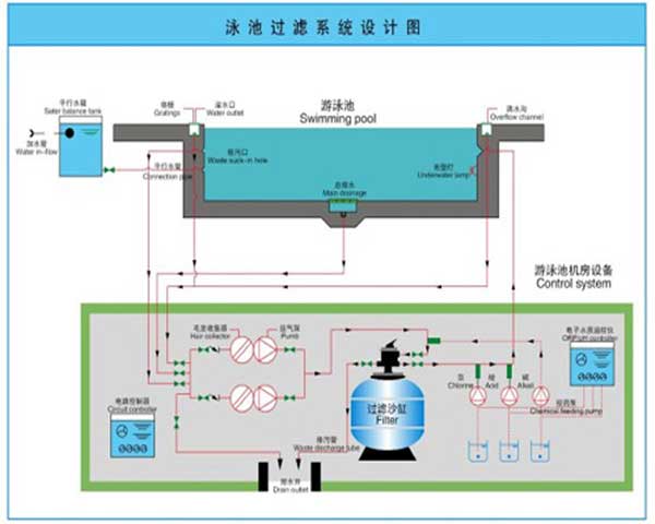 泳池水過濾凈化工藝包括:“降低池水的渾濁度、提高池水的透明度、去除池水中膠狀或顆粒狀有機物、細菌和病毒”。保證游泳者的安全、衛(wèi)生,對池水進行過濾是不可缺少的。