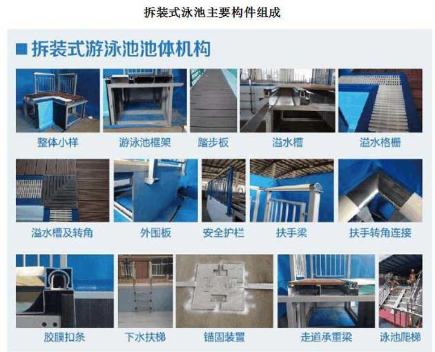 拆裝式游泳池又稱活動泳池或拼裝式游泳池、拼裝泳池;也是近些年市場涌現出的一種新型游泳池產品。其原理是在工廠完成所有標準構件的定制生產、采用現場拼裝作業方式完成各種規格游泳池設施的組裝建設。拆裝式游泳池可以根據用戶使用需求快速安裝于大多數符合要求的簡單平整場地、相對于普通土建游泳池而言具有顯著的場地適應性和反復安裝拆卸特性,故命名為拆裝式游泳池。按照國家標準,拆裝式游泳池應該能夠提供普通游泳場館的所有訓練與比賽功能要求。