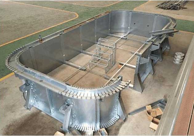 拆裝式泳池是由池體和游泳池水處理系統兩部分組成。池體由鋼架主體結構、內壁承壓防水、外壁裝飾、圍池過道、四周護欄等幾部分組成。一般拆裝式泳池池體的鋼構采用Q-235型熱軋鋼框架結構,以高強度螺栓連接,鏈接螺栓為8.8級,M-14。鋼結構框架、鋼結構溢水槽經過鍍鋅防腐處理,表層還有兩層防腐處理,一層防銹,二層防腐。溢水槽上方一般鋪設溢水格柵,常用寬度規格有250mm、300mm、400mm等幾種,可根據不同需要進行選擇。內壁承壓板一般為300mm*30mm、單皮厚度為2.5mm的PVC中空板材或者1.5mm的鍍鋁鋅鋼板,泳池防水層厚度為1.2mm的具有抗拉加強筋的進口泳池專用膠膜組成,且膠膜采用高頻焊接制作。外壁裝飾和圍池過道均由優質pvc材料制作而成,美觀耐用。四周護欄采用不銹鋼或者碳鋼噴涂材料制成。泳池水處理系統根據泳池蓄水量配置,處理效果可達到《國際泳聯(FINA)游泳池水質衛生標準》。