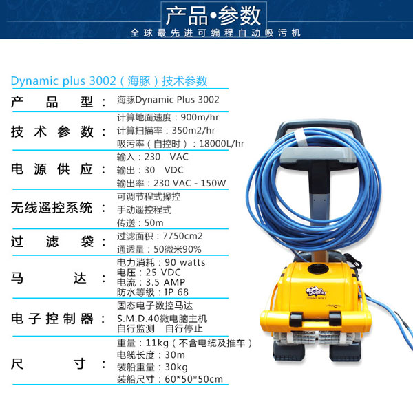 海豚3002全自動吸污機,本身設置有智能程序控制裝,可編程,根據(jù)游泳池的大小設定不同的模式,具有掃描泳池,鎖定記憶等功能。智能化全自動的清潔泳池,靈活方便。不用人工操作,省時省力。