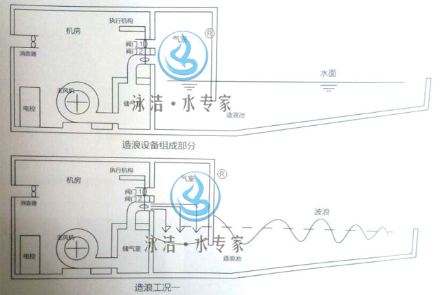 氣壓造浪系統(tǒng)主要蓄壓室、風機、閥門機構(gòu)、風管系統(tǒng)、電子智能造浪是一項多學科綜合性的設備工程,它涉及空氣動力學、波浪力學、機械學、電氣控制系統(tǒng)學等幾門學科。但關(guān)于波浪產(chǎn)生的基本原理,可以形象而通俗的概括為一句成語興風作浪。它與海嘯產(chǎn)生原理基本一致,都是由于壓力的變化而形成波浪。