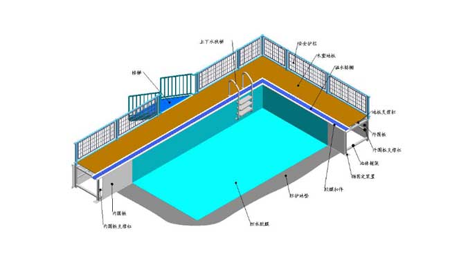 泳池池體由池體框架結構、內外圍板、池內防水膜、溢水槽、池內上下水扶梯、池體表面人行通道、安全護欄、泳客上下池體樓梯等組成。